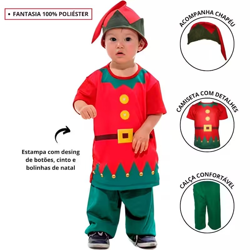 Ideal para criar memórias inesquecíveis durante o Natal, esta fantasia é perfeita para usar em eventos temáticos e festas de final de ano.