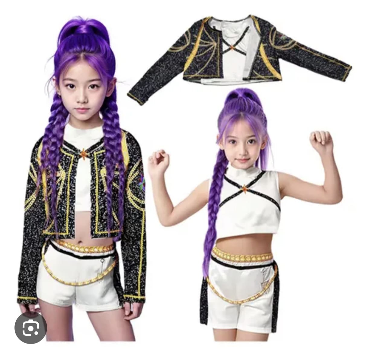 Visual de Idol: Inclui jaqueta preta, cropped, short, frequentemente com detalhes em roxo.