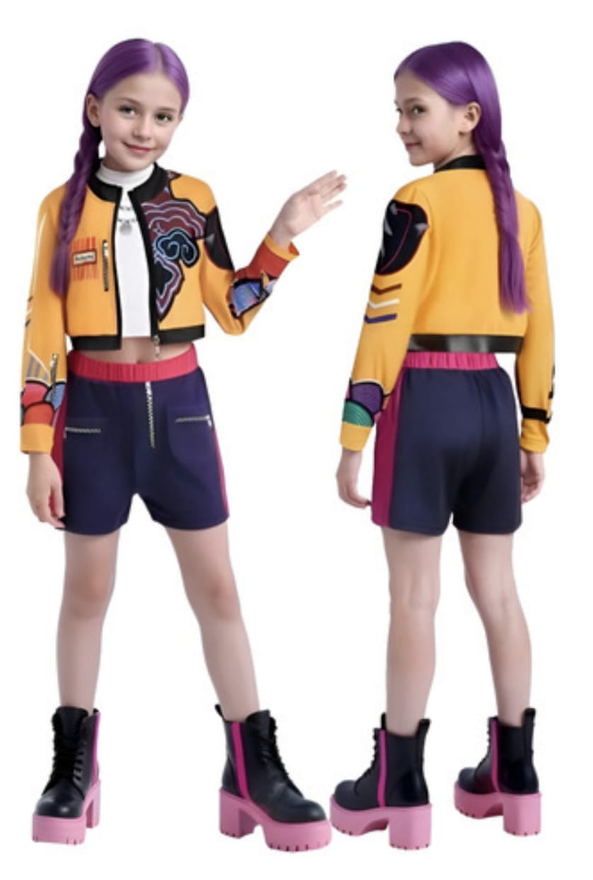 O conjunto geralmente inclui uma jaqueta bomber amarela e preta, top branco cropped, shorts azul royal com detalhes rosa e materiais confortáveis como malha ou vinil para dança.