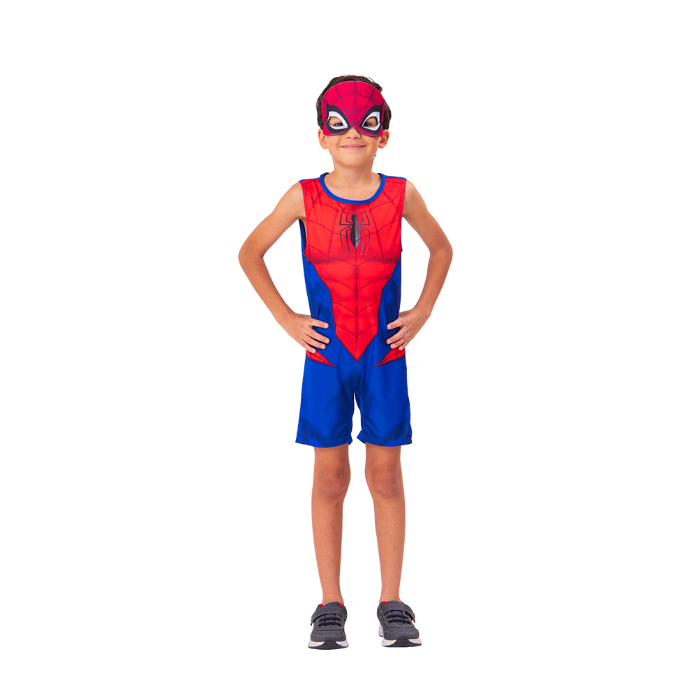 Feita em 100% poliéster, apresenta o clássico design vermelho e azul, incluindo um macacão curto (mangas e pernas) e máscara em espuma dublada.