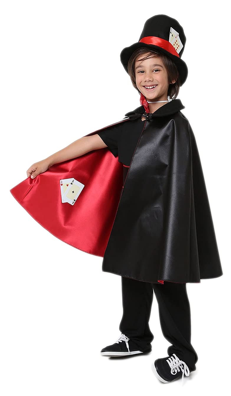 A fantasia de Mágico da marca Masquerade Fantasias é um conjunto elegante e lúdico, composto por uma capa preta, chapéu (cartola) e gravata.
