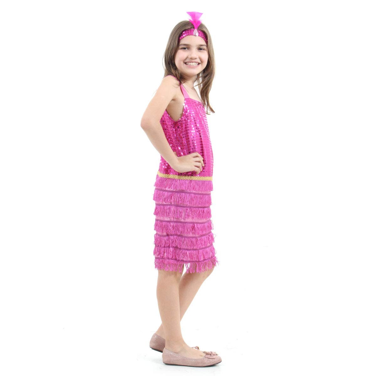 Confeccionada em poliéster, inclui um vestido charmoso com franjas e detalhes em paetês/lantejoulas, além de uma faixa de cabeça com pena (estilo tiara), garantindo conforto e estilo para crianças.