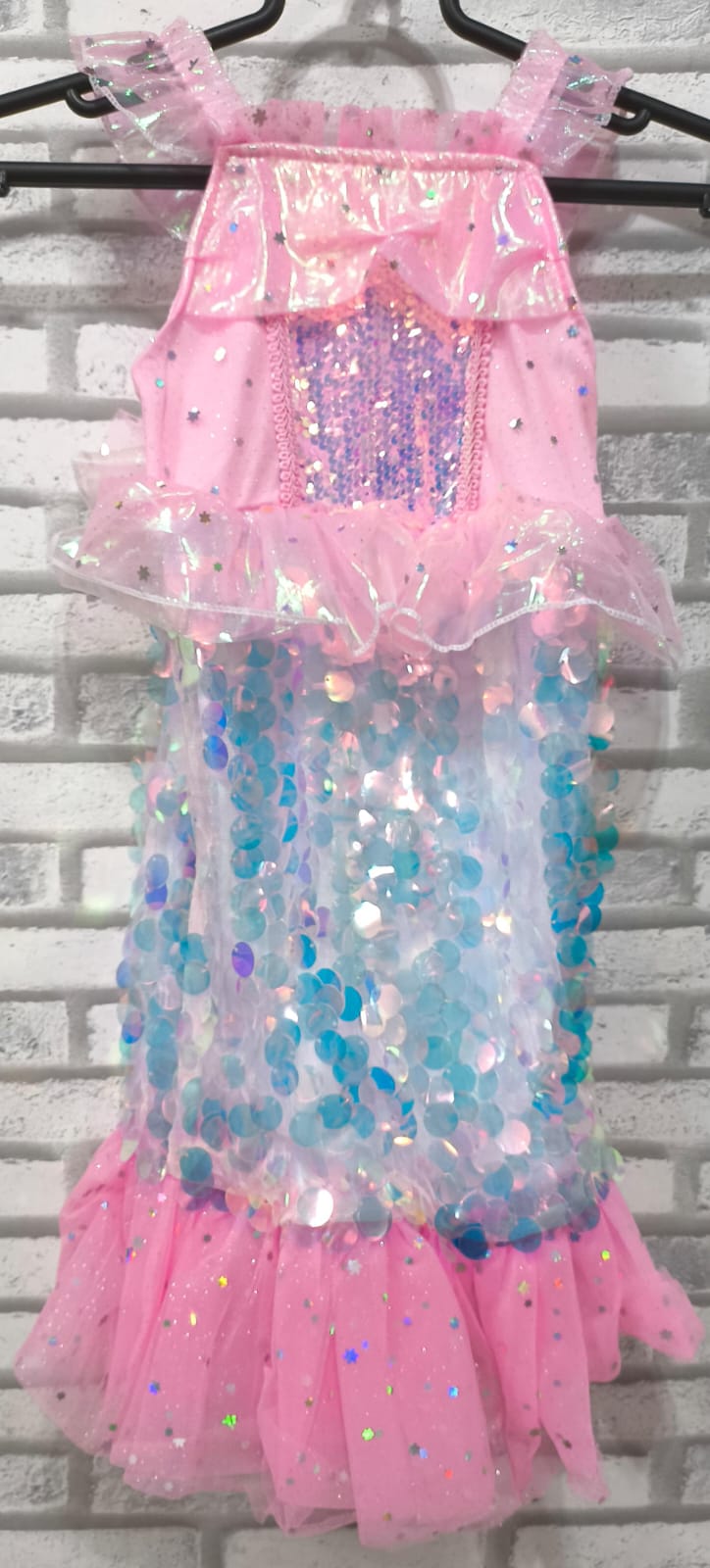 Esta deslumbrante fantasia de sereia traz lantejoulas iridescentes que simulam escamas brilhantes, criando um efeito mágico sob a luz.