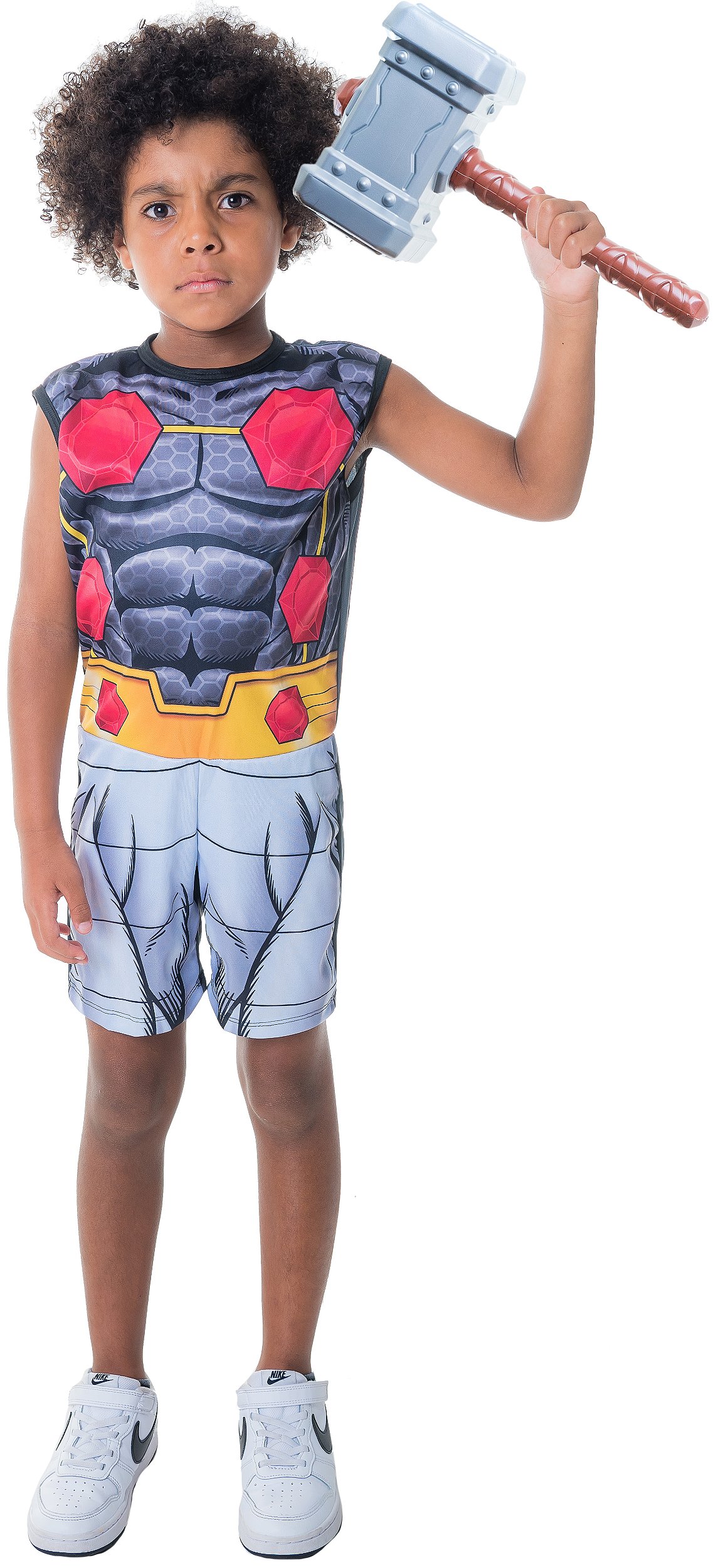 Contem: 1 Fantasia de macacao curto com martelo do personagem