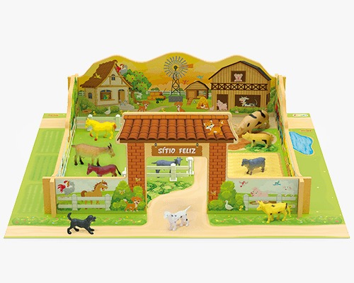 Inclui uma base cenográfica (50x46cm), peças encaixáveis, cercas plásticas e 10 animais em plástico flexível, estimulando a imaginação e a coordenação motora fina.