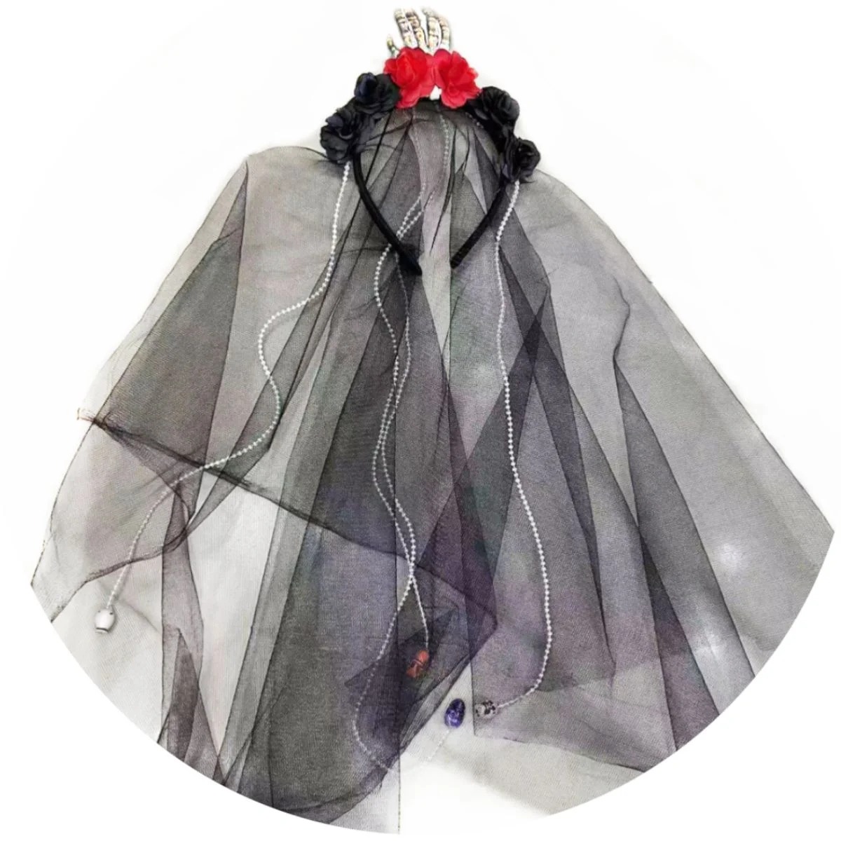 A tiara da "Noiva Cadáver" preta é decorada com flores escuras, detalhes de rosas vermelhas, véu preto em tule e inclui crânio branco para complementar a fantasia de Halloween.