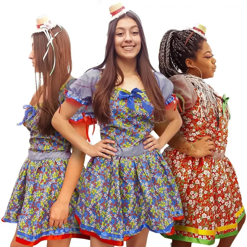 Estilo: É um vestido de festa junina/caipira, muitas vezes com modelagem ajustada ao corpo na parte superior e saia rodada.